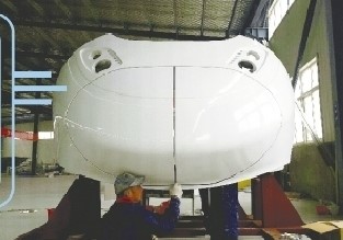 青岛正能交通装备有限公司技术人员在生产350公里/小时动车新材料车头罩。